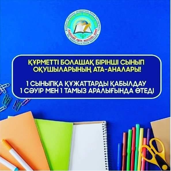 Қазақстан Республикасы Білім және ғылым министрінің 2020 жылғы 24 маусымдағы № 264 бұйрығына сәйкес 2023-2024 оқу жылына 1-сыныпқа құжаттарды қабылдау 2023 жылдың 1 сәуірінен бастап EGOV.KZ электрондық үкіметінің порталы арқылы жүзеге асырылады.