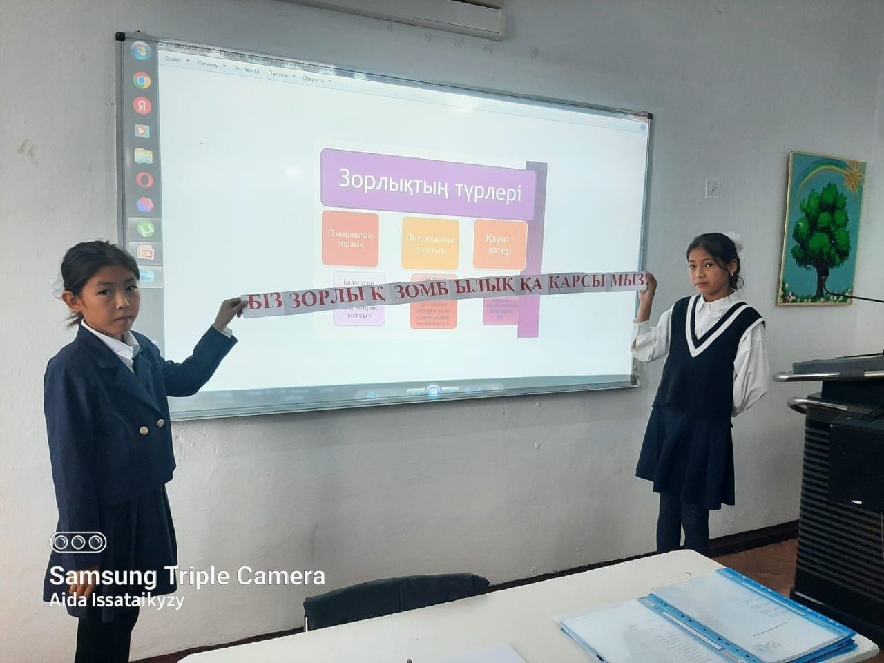 “Қатыгездіксіз және зорлық-зомбылықсыз балалық шақ”тақырыптарында 6,9,11 сыныптарда өтілді.