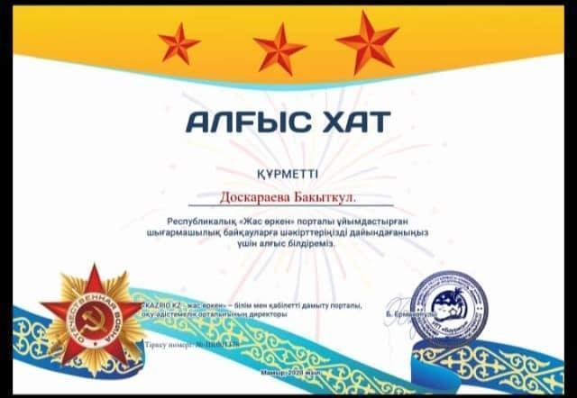 Саттар Естемесов атындағы шағын орталықты орта мектебінің білім алушысы Болатхан Инабат "Абай оқулары" атты қашықтықтан өткен республикалық байқауына қатысып I дәрежелі дипломмен марапатталды. Оқушыны қатыстырғаны үшін сынып жетекшісі Доскараева Бакыткул алғыс хатпен марапатталды.