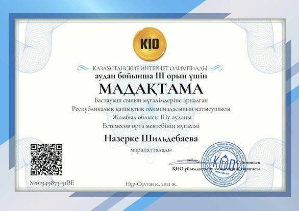 25 желтоқсан 2020 0 1 2 3 4 5 Ұстаздар жетістігі Бастауыш сынып мұғалімдеріне арналған Республикалық қашықтық олимпиадасының жеңімпазы Жамбыл облысы Шу ауданы Естемесов орта мектебінің мұғалімі Назерке Шильдебаева.