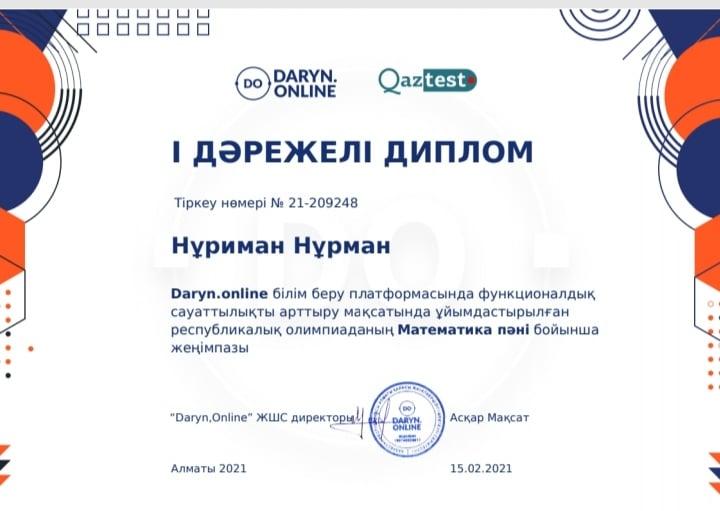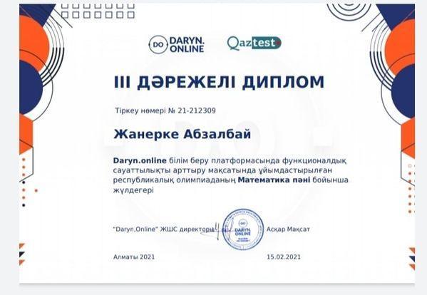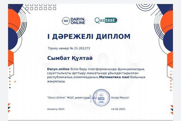 Саттар Естемесов атындағы орта мектебінде Daryn.online білім беру платформасында функционалдық сауаттылықты арттыру мақсатында ұйымдастырылған Республикалық олимпиаданың Математика пәні бойынша мектебіміздің оқушылары онлайн олимпиадаға қатысып І, ІІ, ІІІ дәрежелі дипломдармен марапатталды.