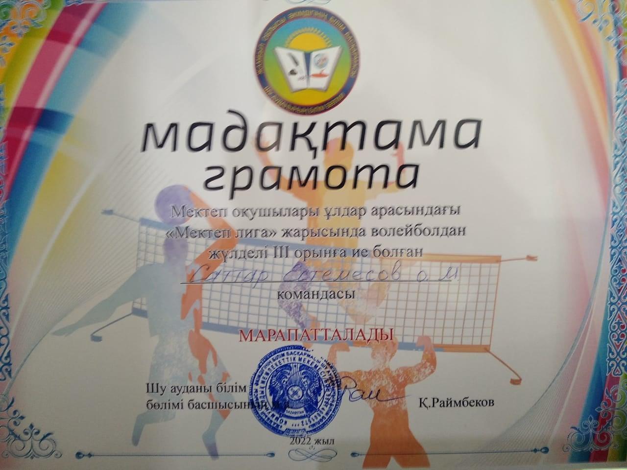 04 ақпан 2022 0 1 2 3 4 5 "Мектеп лига" жарысында волейболдан жүлделі 3 орынға ие болды. Саттар Естемесов атындағы орта мектептің оқушылар командасы аудандық ұлдар арасындағы "Мектеп лига" жарысында волейболдан жүлделі 3 орынға ие болды.