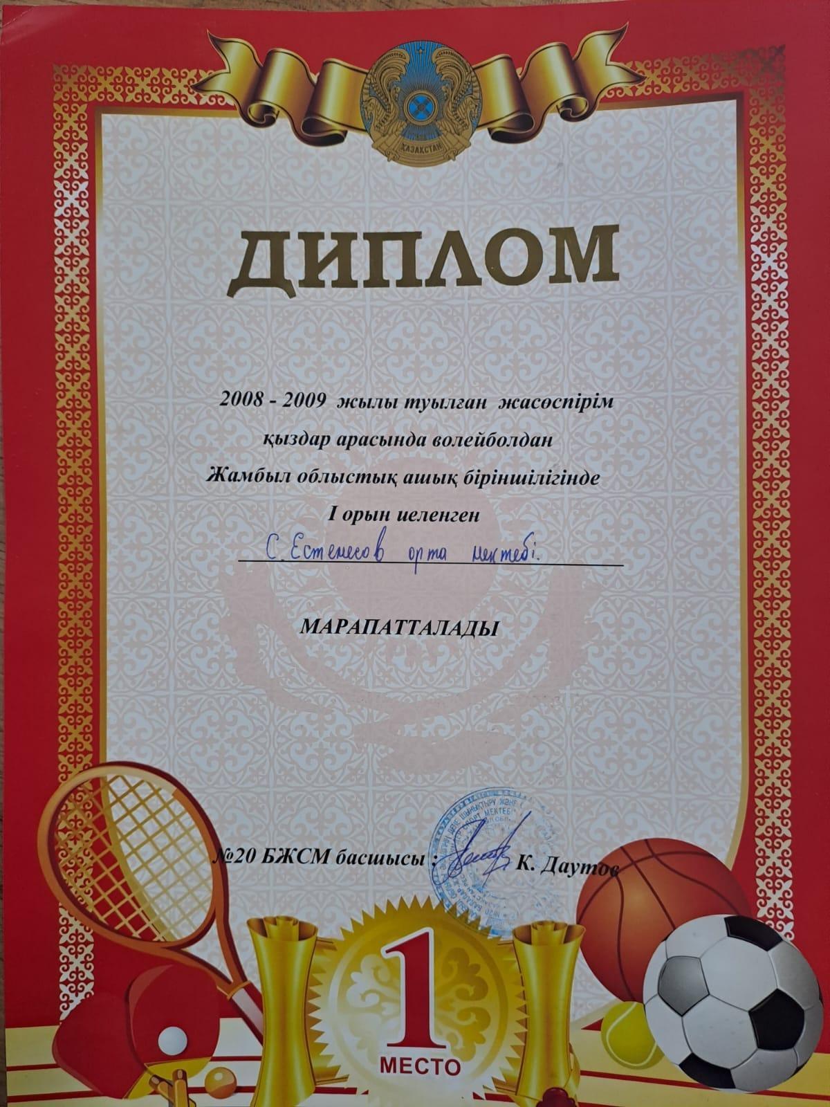 2008-2009 жылы туылған жасөспірім қыздар арасында волейболдан Жамбыл облыстық ашық біріншілігінде I орын иеленген Саттар Естемесов атындағы орта мектебі дипломмен марапатталды. » Саттар Естемесов атындағы шағын орталықты орта мектебі