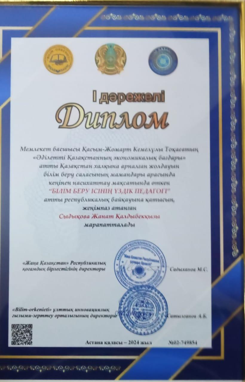 06-07.03.2024 жылы Астана қаласында Қазақстан Республикасының Оқу-ағарту министрлігінің ақпараттық қолдауымен "Bilim-orkenieti" ұлттық инновациялық ғылыми -зерттеу орталығының мемлекет басшысы Қ.Тоқаевтың "Әділетті Қазақстан: білім беру саласындағы ұлттық құндылықтар" атты халыққа жолдауын насихаттау мақсатында ұйымдастырылған "Үздік педагог" республикалық форумы болып өтті. Осы форумға Саттар Естемесов атындағы орта мектебінің бастауыш сынып мұғалімі Сыдықова Жанат Қалдыбекқызы қатысты.Ұзақ жылдар бойы тынбай, жалықпай,ұстаздың қызметінің озық нәтижесінде І дәрежелі дипломымен және "Ыбырай Алтынсарин" төсбелгісі , І дәрежелі диплом және "Білім беру ісінің үздік педагогы" төсбелгісі және "Жаңашыл педагог 2024" төсбелгісімен марапатталды.