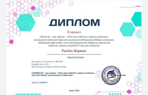 Саттар Естемесов атындағы орта мектебінің 4 «ә» сынып оқушылары «kazrio.kz –жас өркен» білім мен қабілетті дамыту орталығы қолдауымен ұйымдастырылған жалпы Республикалық байқауға қатысып «Қазақтың қара өлеңі» атты шығармашылық байқауында Рысбек Жарқын ІІ дәрежелі дипломмен, Сатыбалды Нұрила ІІ дәрежелі дипломмен марапатталды.