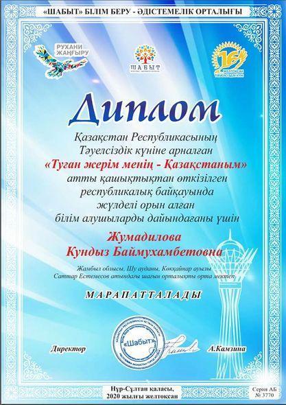 Қазақстан Республикасының Тәуелсіздік күніне орай"Тәуелсіздік жерім менің-Қазақстан" республикалық қашықтықтан өткізілген республикалық байқауда "Мәнерлеп оқу","Сурет"номинациялары бойынша Пхмет Аруна,Сейсен Рауан,Бекбосын Рауан,Еркебұланқызы Ақбота,Қырғызбай Аяулым,Құрманқұл Арсен,БайрақМадияр,Жанысбек Арсен,Тоқан Ақарыс бас жүлде, 1,2,3 дәрежелі дипломдарға ие болды.Сынып жетекшілері Жұмадилова Құндыз, Құдагелдиева Гүлмира,Рахиева Салтанат дипломдармен марапатталды