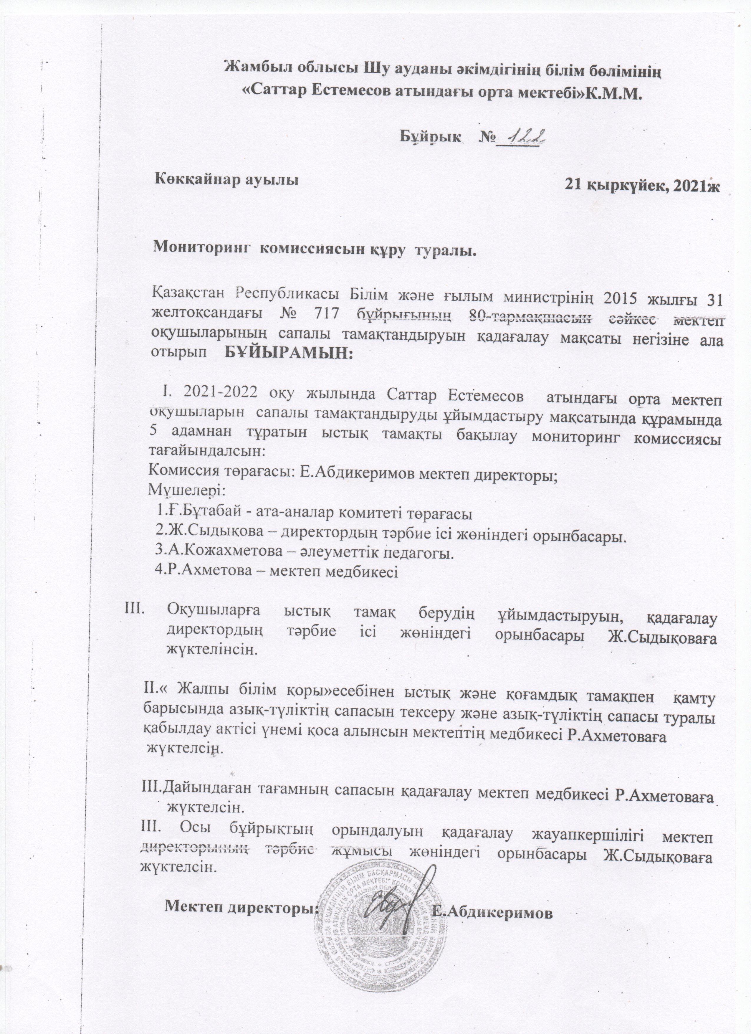 Бракераж мониторинг комисиясын құру туралы бұйрық » Саттар Естемесов атындағы шағын орталықты орта мектебі